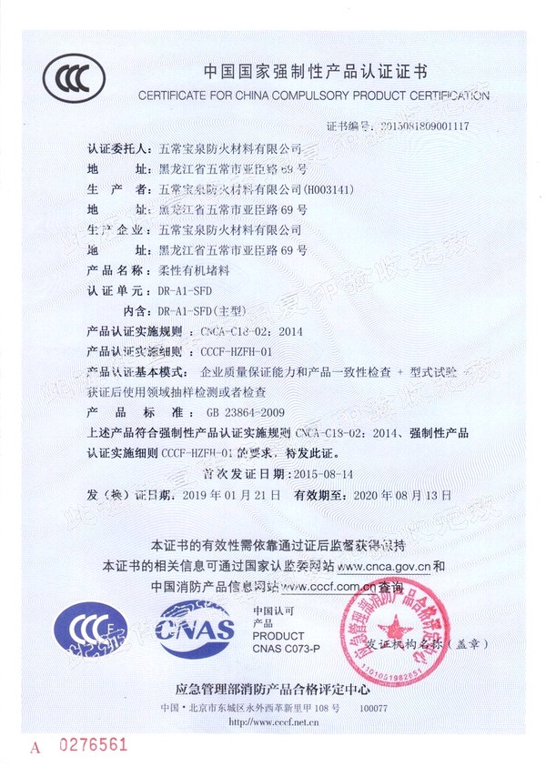 企業簡介 五常寶泉防火材料有限公司(黑龍江省寶泉消防設備有限公司)是主要制造、經營、銷售防火阻燃材料系列產品。其中以自粘性阻燃包帶(ZFBD)、阻火包(PFB)、有機防火堵料(SFD)、室內超薄型鋼結構防火涂料(NCB(BCF)-1)為主要產品。寶泉牌防火材料系列產品是普通防火材料的更新換代產品,防火性能優異,具有普通防火材料沒有的諸多優點:施工方便、經久耐用、耐火極限高、熱傳導率低、耐腐蝕、抗老化、無毒無害、環保、可以連續施工等特點。產品廣泛應用于電力企業(各型電廠、輸變電公司、電建公司、電力公司)、石油化工企業、冶金業、通訊業、地鐵、隧道、...